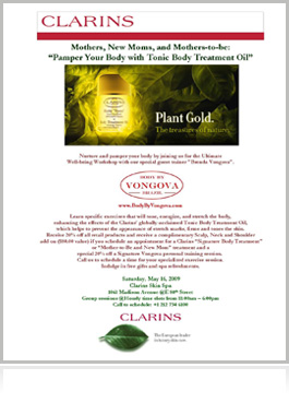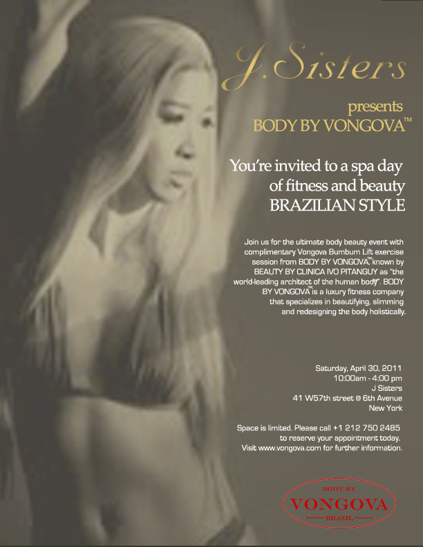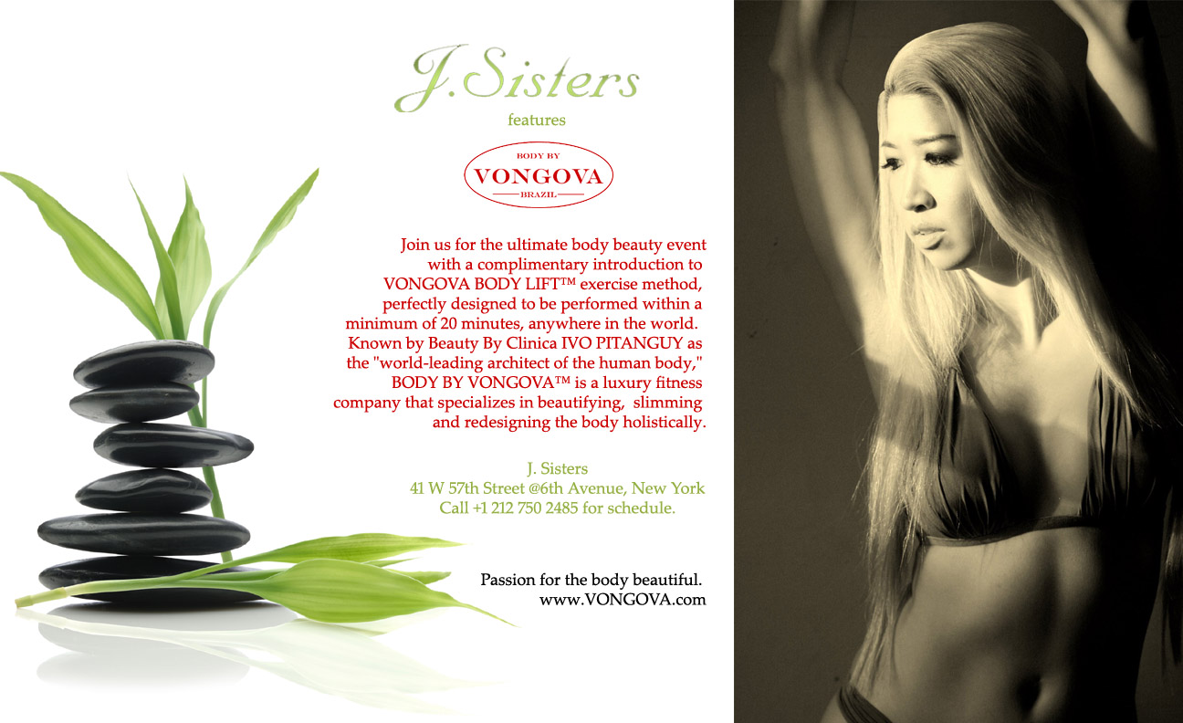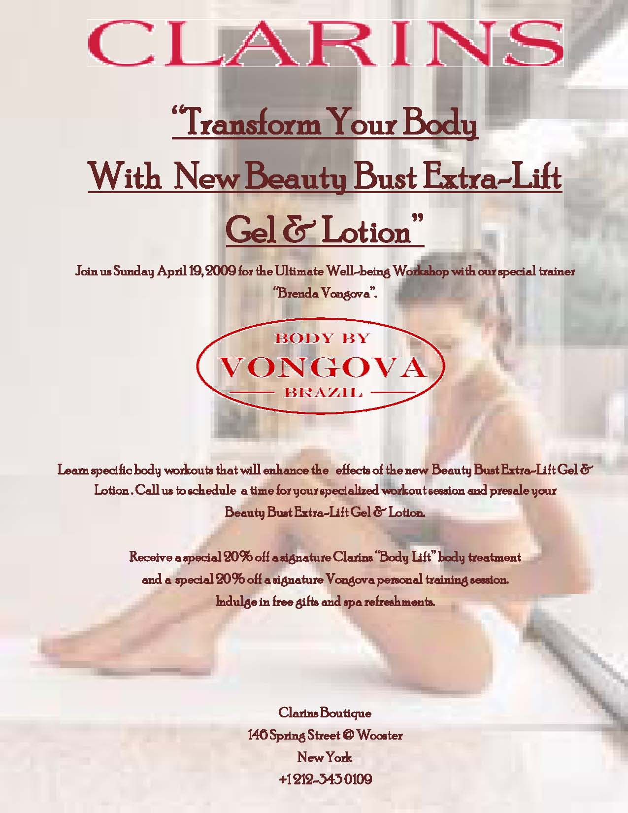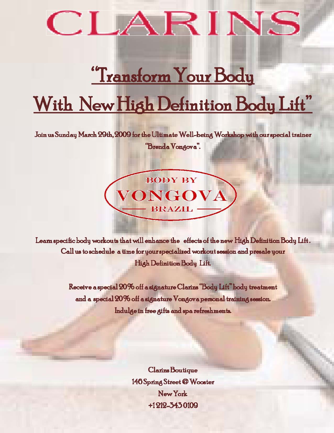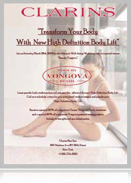 Coupled by her passion for beautifying the body and talent for secretly pushing her personal clients to their maximum limits using a nurturing approach, Clarins - the beauty leader in body and cellulite control – has invited Vongova to teach her secrets at the institute’s well-being workshops to enhance the effect of their body products, such as their #1--selling “Lift-Minceur Haute Définitions.”