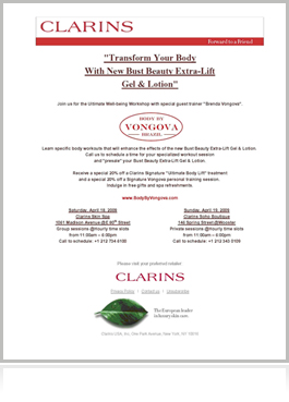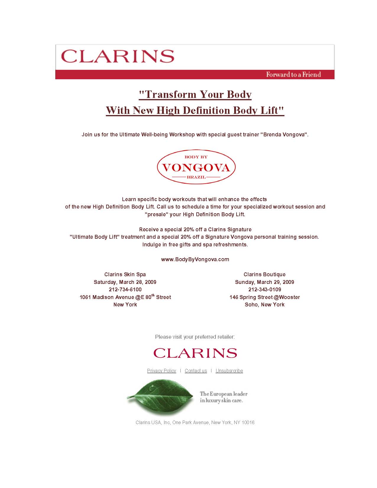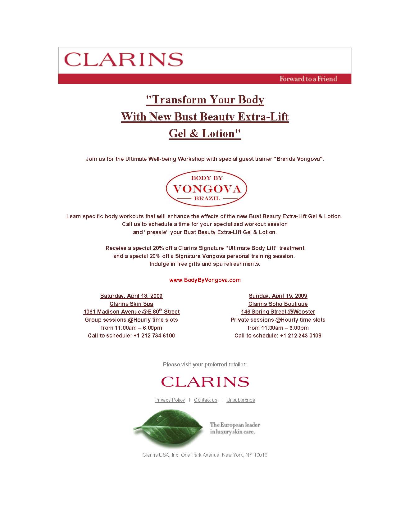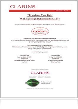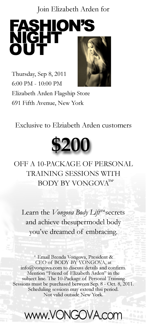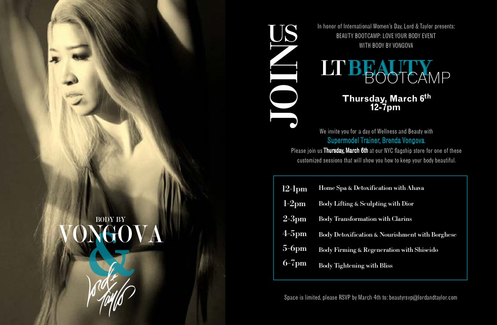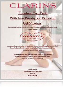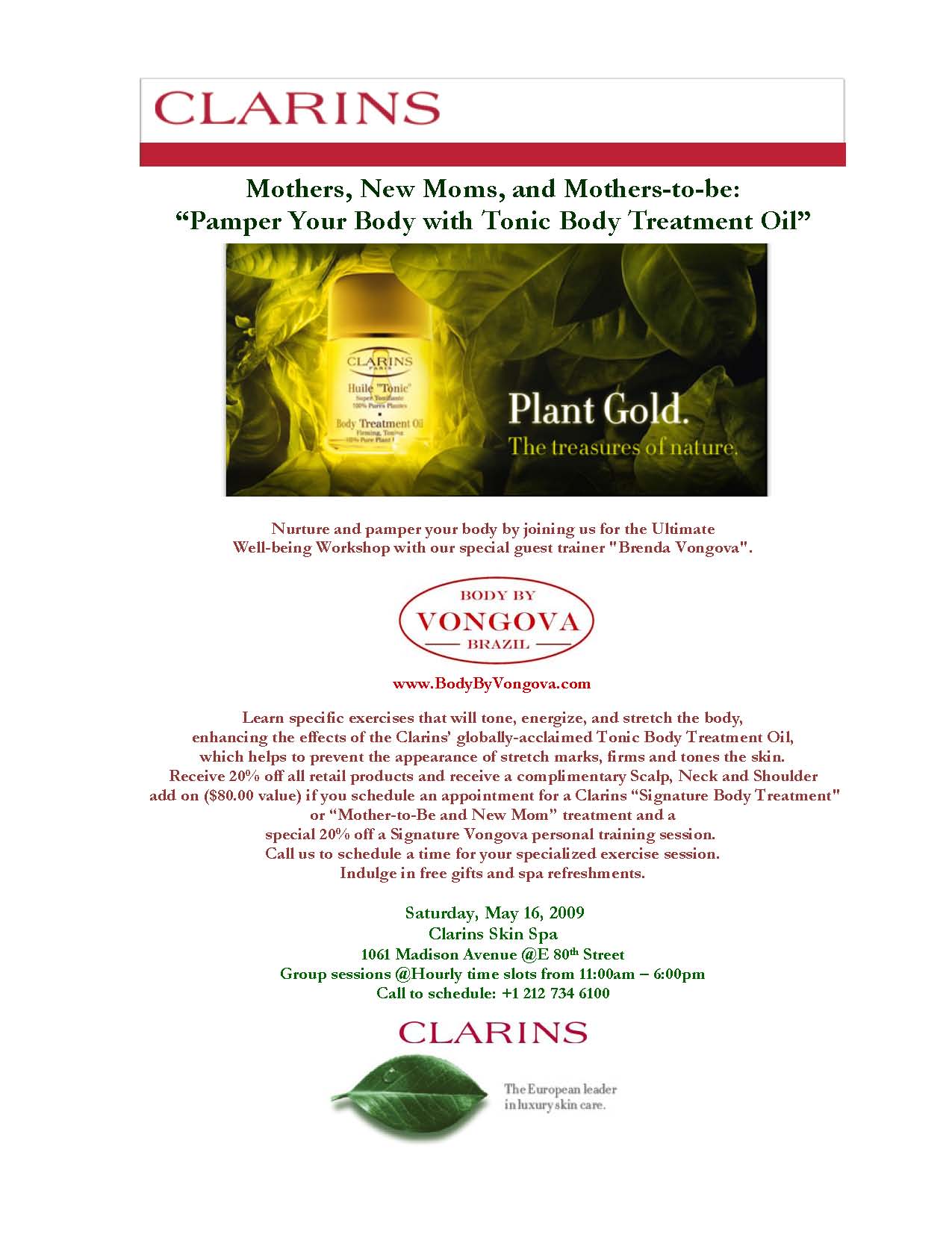 Coupled by her passion for beautifying the body and talent for secretly pushing her personal clients to their maximum limits using a nurturing approach, Clarins - the beauty leader in body and cellulite control – has invited Vongova to teach her secrets at the institute’s well-being workshops to enhance the effect of their body products, such as their #1--selling “Lift-Minceur Haute Définitions.”